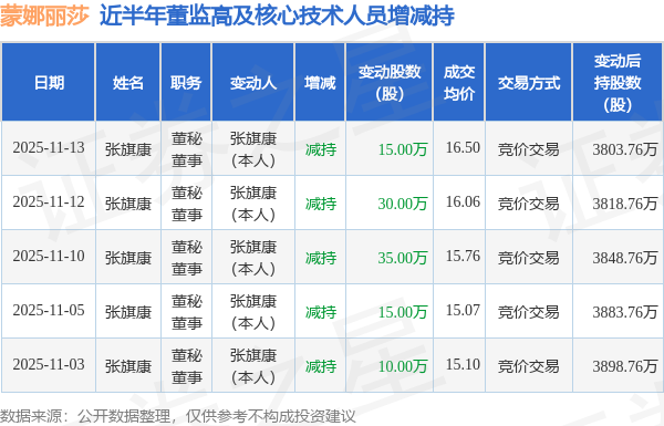 证券之星消息久联优配,根据11月14日市场公开信息、上市公司公告及交易所披露数据整理,蒙娜丽莎(002918)最新董监高及相关人员股份变动情况:2025年11月13日公司董秘,董事张旗康共减持公司股份15.0万股,占公司总股本为0.0367%。变动期间公司股价下跌0.99%,11月13日当日收盘报16.05元。